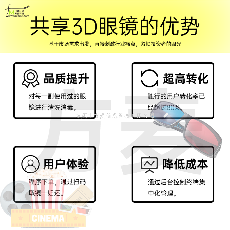同一个人不可能追着看每一部3D电影,但是每一部3D电影的观众都要用到3D眼镜。凭借“临时刚需”的特殊性,方麦共享3D眼镜获得了所有利益相关方的一致认可,观众满意,影院支持,商家推崇,资本看好,市场反馈也呈现出蓬勃的态势。随着市场普及率的进一步扩大,转化率有望突破90%。