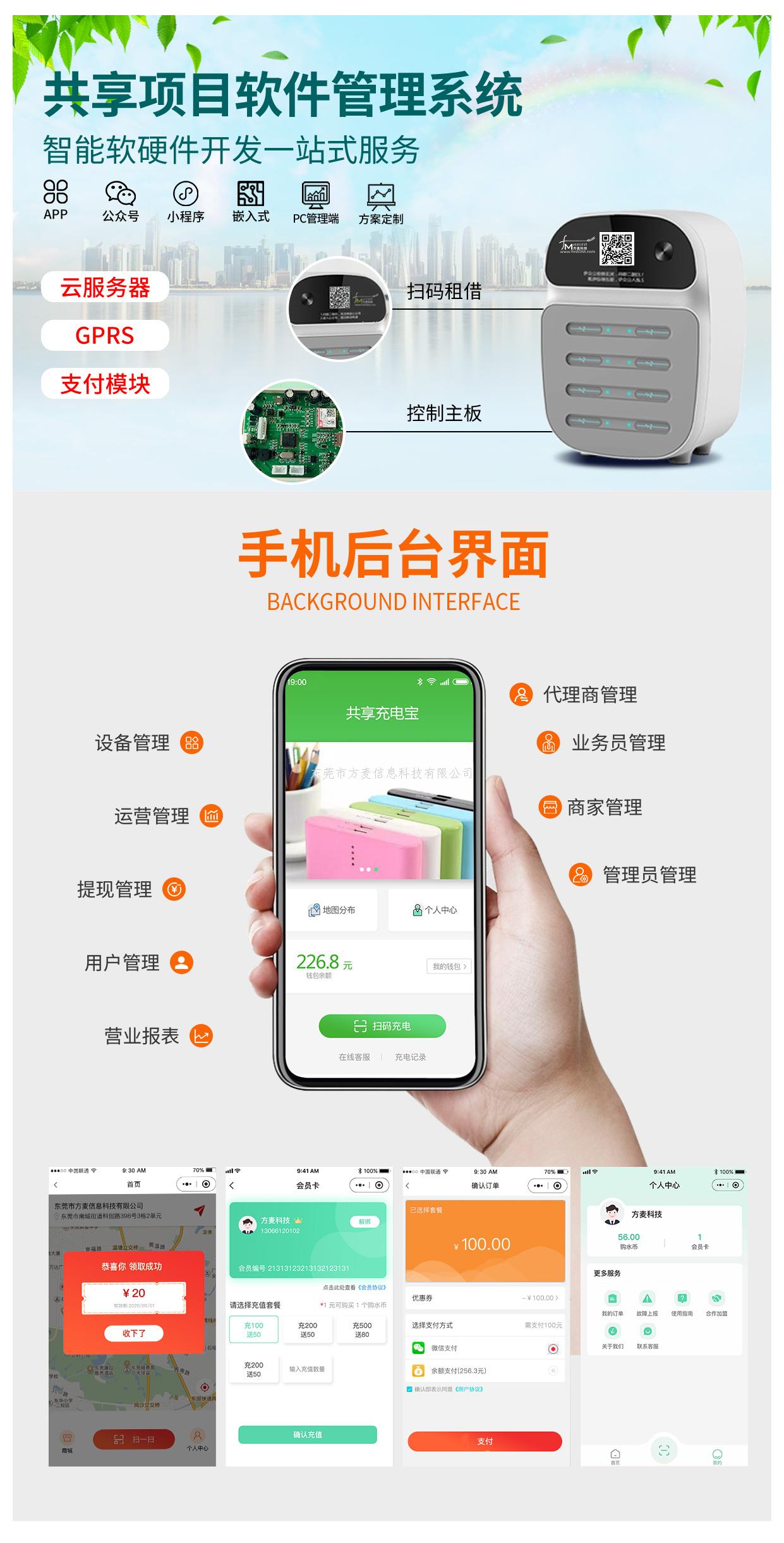 3、扫码管理系统:(包括:、用户安卓APP、苹果APP、后台管理系统及服服器搭建)后台管理(区域、代理、会员、套餐、设备监测、优惠券、流水、统计、分析、充电宝柜管理、充电宝管理等)。